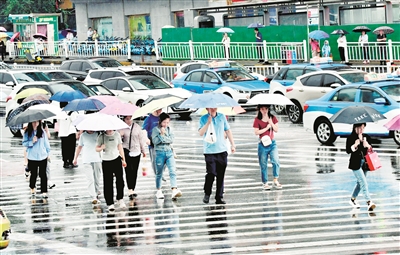 受冷空气影响,7月2日,我市出现明显降水天气过程。伴随降水天气,当日最高气温下降至24℃。阳泉市气象台2日16时发布天气预报:预计未来两天,全市多分散性阵雨或雷阵雨天气。2日夜间到3日白天,多云,局地有阵雨或雷阵雨,东风转东北风2-3级,最低气温14℃到15℃,最高气温29℃到31℃;3日夜间到4日白天,多云,局地有阵雨或雷阵雨,北风转东风2-3级,最低气温17℃到19℃,最高气温30℃到32℃。图为在北大街,市民打伞出行。晋向华摄