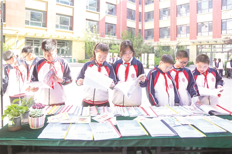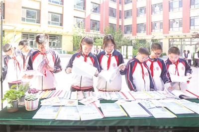 在学校的“百年老槐文化区”,来自市十中、市二十中、杨家庄学校、巨兴小学、高新区实验小学、阳泉市育英学校、下五渡小学7所学校的阅读成果展板、绘画书法作品和读书资料,吸引了不少刚刚走进校园的学生驻足观看。高新区教育处相关负责人、各学校校长和教师代表怀着浓厚的兴趣,翻阅展台上的阅读成果展示资料。