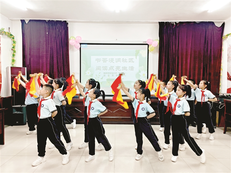本报讯 记者吴琦 张泽慧摄影报道 4月22日,市实验小学开展以“书香浸润社区 阅读点亮生活”为主题的第八届校园读书节“进社区”活动,30余名师生来到城区上站街道小阳泉南社区党群服务中心,与居民共同读书。