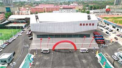 日前,阳泉体育馆提质改造项目主体外装已完工,正门右上方的“阳泉体育馆”五个红色大字熠熠生辉。改造后的阳泉体育馆共设有3354个座位,将达到国家乙级场馆标准,可满足地区性和全国性单项比赛场地要求,还可作为阳泉市主要应急避难场所。图为4月26日,无人机拍摄的阳泉体育馆。晋向华摄