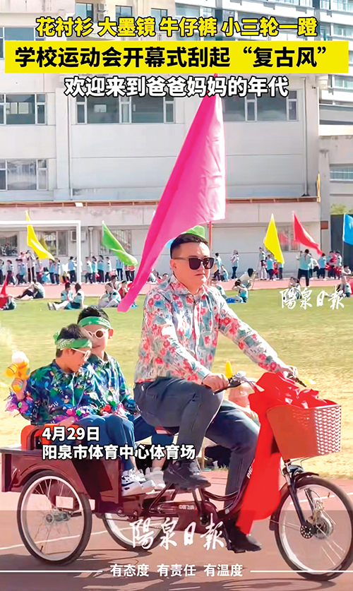4月29日,下站小学新百年第二届田径运动会拉开帷幕。开幕式亮点纷呈,家长们身着牛仔裤、花衬衫等“复古”服饰,蹬着“复古”小三轮缓缓入场。刹那间,时光仿若回溯至上世纪八十年代。这样的装扮与物件,引发大家强烈的怀旧共鸣,为运动会增添了浓郁且温情的年代氛围感。