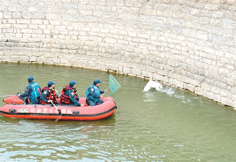 经过1个多小时的车程,他们抵达救援现场。救援队员看着距离池边较远的天鹅,凭借以往的救援经验,分成两拨人,进行施救。其中,有队员坐上皮划艇,拿着网兜向天鹅所在的方向划去。在即将到达天鹅所在位置时,天鹅受到惊吓,飞到了另一拨队员所在的位置,队员顺势抓住天鹅。