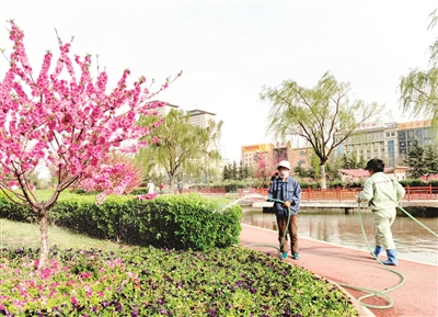 近段时间,市园林管理处组织人员在桃河公园内进行植被养护、树木修剪等工作,为市民提供更加优美宜人的游园环境。