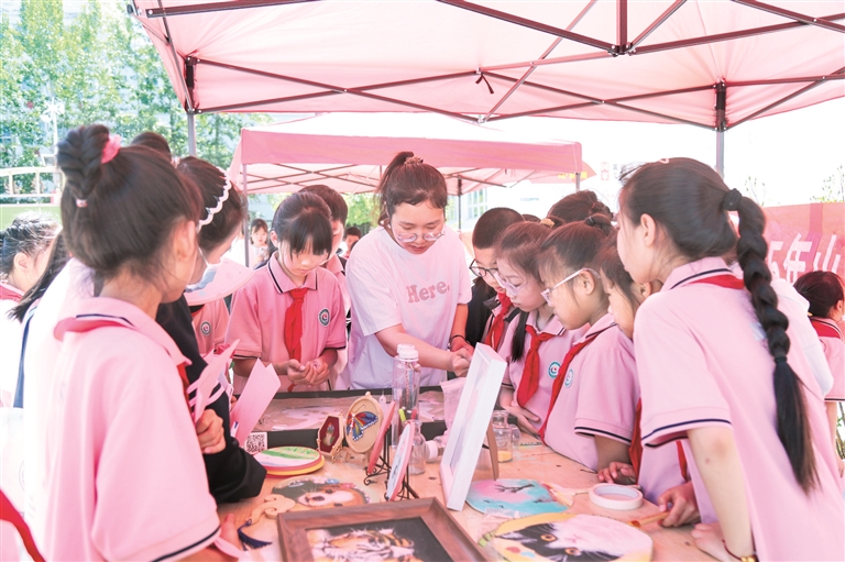 学生不仅可以欣赏表演,还可以沉浸式体验非遗技艺。用彩色沙子画一只粉色的兔子,在石头上绘制喜欢的图案,体验珐华器立线工艺,用面捏一朵粉色玫瑰……各个展位前挤满了学生,活动现场欢声笑语不断。河边街社区工作人员张贝宁带来了炭精画、剪纸、掐丝沙画作品,精致的线条、丰富的颜色吸引了众多学生询问。学生们高涨的热情让张贝宁心情特别愉悦,她一一解答了学生的提问。张贝宁说:“这些作品是由河边街社区党委书记、主任董淑芳创作的。我跟着主任学习了两年时间,感受到传承文化需要热心、耐心、细心,例如掐丝工艺,金属丝很细,细致的操作才能做到与底稿一致。”河边街社区将“体验非遗”打造成社区特色,建立了“非遗之家”,通过举办丰富活动吸引居民参与体验,走进新泉小学、城区实验幼儿园等辖区单位展示文化魅力。在2025“阳泉消费季”桃河市集活动中,河边街社区展出的非遗作品受到了大众喜爱。