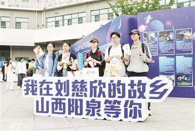 刘慈欣科幻文学展区前,众多“科幻迷”纷纷拍照打卡,不时有人拿起《三体》翻看,仿佛置身于浩瀚缥缈的宇宙,穿越时空、洞见未来。深蓝色宣传展板上的内容全面展示了刘慈欣的成长经历、创作历程及文学成就,激发了学子们对科幻文学的浓厚兴趣。“《三体》中描绘的世界就发端于这片曾经以煤为傲的土地,阳泉的好风光不仅仅体现在自然风景中,也体现在刘慈欣老师的作品中。”中国石油大学(华东)阳泉籍大三学生高子如指着展板上的图案感叹道。