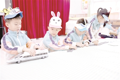 车站工作人员提前设计了十分有趣的剧情。志愿者郝奕星带领大家一起玩闯关游戏。戴着大象、小兔、天鹅等头饰的小朋友们分成三组争着闯关,一下子就变成了“彩虹小火车”的守护小卫士。大家听声音找问题、拼拼图、排查隐患,一点点解开谜团;在问答环节里动脑筋找通关密码,还发现了车顶挂风筝的秘密,一起抢修铁路。小朋友们亲手画信号灯、拼轨道,看着小火车跑起来,很快就记住了爱路护路知识。