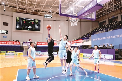 6月18日,第四届“青花汾酒杯”阳泉市职工篮球赛县区组决赛在市体育中心体育馆开赛,郊区总工会队与盂县政府队展开激烈比拼,争夺冠军。