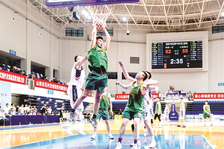 6月18日,第四届“青花汾酒杯”阳泉市职工篮球赛工矿企业组决赛在市体育中心体育馆开赛,华阳一矿队对战山西鼎兴队,打响冠军争夺战。