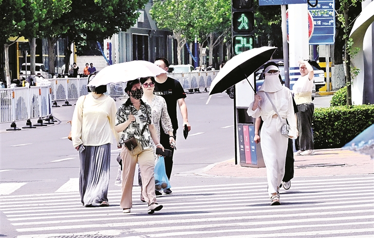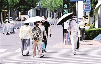 7月15日11时,市气象台发布高温橙色预警信号,预计未来24小时,我市最高气温将升至37℃以上,同时提醒市民尽量减少户外活动,高温条件下作业和白天需要长时间进行户外露天作业的人员,应采取必要的防护措施。图为在泉中路,出行的市民“全副武装”应对高温天气。晋向华摄
