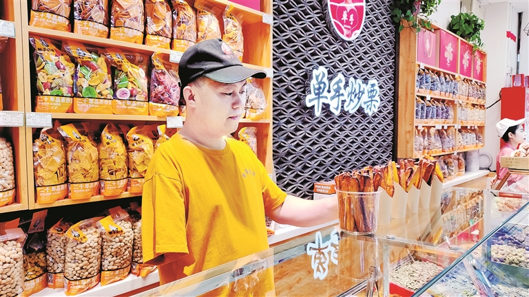 如今,单手炒栗生意越做越大,规模最大的分店有80余种干货,员工也越来越多。负责技术的李海鹰每天一大早起来就要去店里收拾橱窗、填补货物,准备当天的糖炒栗子。负责后勤采购的孙鹏就到仓库点货、补货,再从冷库中拿出每天要炒的栗子逐一进行人工挑拣。