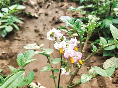 不同品种的马铃薯在试验田里呈现出鲜明个性。川引2号的粉花在绿叶间格外亮眼,温志勇介绍:“川引2号成熟期茎秆可达65厘米,目前的长势很好。中薯17号开着零星白花,需观察后期结薯数量。京张薯3号的长势差,可能是积温不够,也可能是不适应当地的土壤酸碱度,得持续跟踪。”