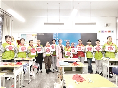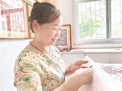 如今,王秀珍的剪纸不仅走进社区,还走进学校。自2013年起,她开始在村幼儿园任教,并陆续为4所小学提供课后剪纸教学服务。十余年来,她在课堂上为孩子们讲述剪纸的发展渊源、艺术特点和寓意象征,通过现场展示高超的剪纸技艺和娴熟手法,让更多的人了解剪纸、爱上剪纸。