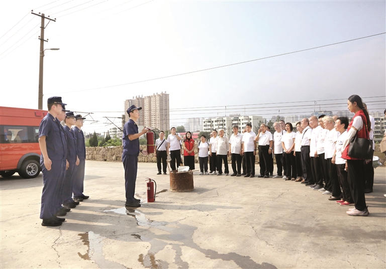 近日,城区上站街道市政府大院社区邀请城区消防救援大队消防员,为社区居民讲解火灾预防、逃生自救等消防安全知识,现场演示灭火器的正确使用方法,并指导居民进行实操练习。杨园园摄