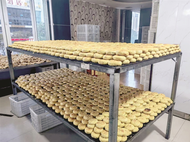 同样忙碌的,还有省级非物质文化遗产盂县桃仁月饼制作技艺代表性传承人张大虎。比起面向本地村民的小型月饼加工坊,张大虎的天元成桃仁月饼“走”得更远。在前段时间举办的第七届山西文化产业博览交易会上,张大虎带着精心制作的盂县桃仁月饼参展。展会期间,他们每天切很多月饼供游客试吃。为了确保游客吃到最新鲜的月饼,工厂每天将现做的月饼送到展会现场。“我们的月饼在文博会上广受好评,每天销售额都在千元以上。不仅如此,我们还接到了好几个销往外地的大订单。这几天,我们正在加班赶制月饼。中秋节前,能将全部月饼送到客户手中。”张大虎说。