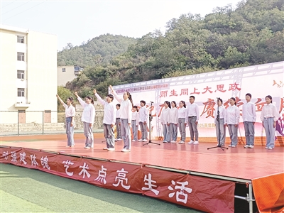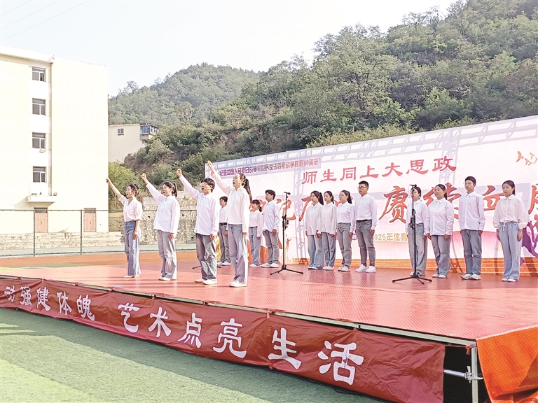 本报讯 记者吴琦摄影报道 9月28日,市十四中在操场举办以“铭记历史 赓续血脉”为主题的“师生同上大思政”诗词歌会。该校全体师生,阳泉师范高等专科学校、东四尺小学、小南坑小学师生代表参加活动。
